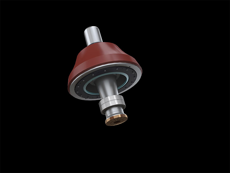 RC系列單缸液壓圓錐式破碎機(jī)工作過程中,電動機(jī)通過傳動裝置帶動偏心套旋轉(zhuǎn),動錐在偏心軸套的迫動下做旋轉(zhuǎn)擺動,動錐靠近定錐的區(qū)段即成為破碎腔,物料受到動錐和定錐的多次擠壓和撞擊而破碎。動錐離開該區(qū)段時,該處已破碎至要求粒度的物料在自身重力作用下下落,從錐底排出。排料口的大小需要靠底部一個液壓缸的升降來調(diào)節(jié)。